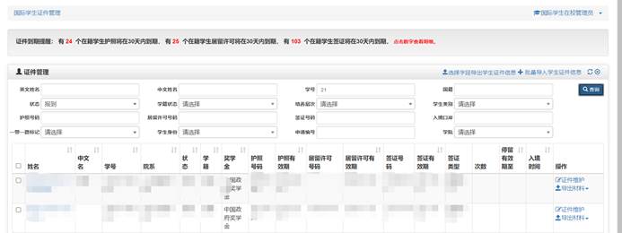 国际学生证件模块可以对学生的证件(护照、签证、居留许可)信息进行维护,可以对即将到期的证件进行提前告警、可以导出相关表格:居留许可手续函、签证申请(停留证件、居留证件)。