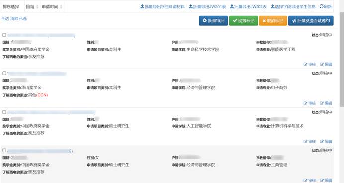 国际学生招生录取管理模块主要包括国际学生报名信息发布、可报名院系、专业、奖学金类型的设置、学生报名申请审核、录取、批量发送面试邀约、查询统计、中介管理、批量导出预录取/录取通知书、批量导出JW201/JW202表、可选字段导出excel汇总等。