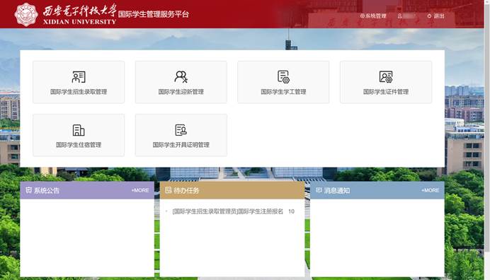 我司为西安电子科技大学定制开发的国际学生管理服务平台,包括“国际学生招生录取管理”、“国际学生迎新管理”、“国际学生学工管理”、“国际学生证件管理”、“国际学生住宿管理”、“国际学生开具证明管理”、“系统管理”等模块。