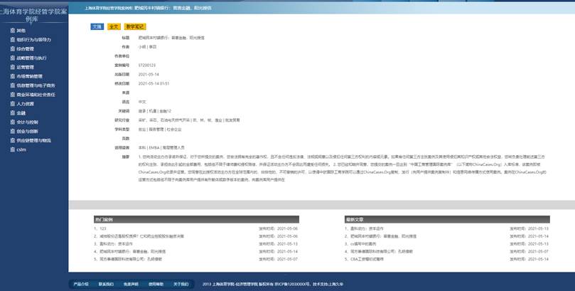 我司为上海体育学院经济管理学院开发的案例库系统,包括“案例库前台网站”、“案例在线预览”、“案例在线投稿”、“案例管理”、“个人案例管理”、“其他基础信息管理”。