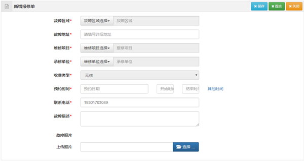 用户可以在线填写报修单。包括故障区域、故障地址、维修项目、预约时间、联系电话、故障描述,可以上传故障照片。用户也可以电话报修,接到电话后由电话接线员替用户录入报修单。