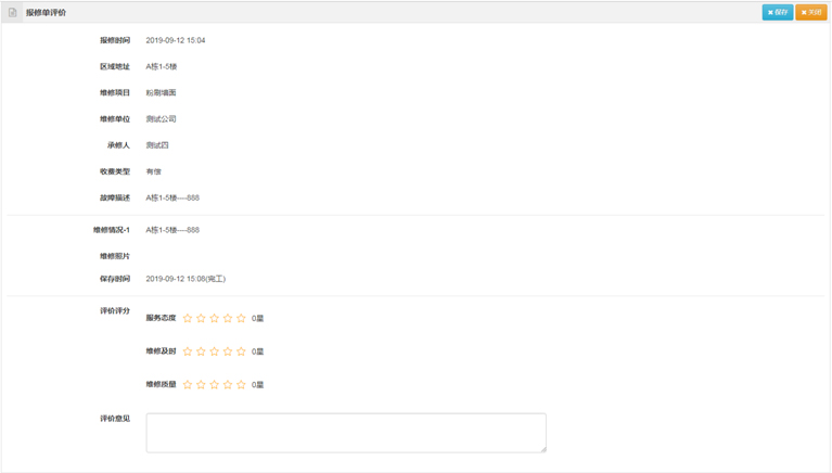 维修完工后,报修人可以对本次报修的维修情况进行评价。管理员可设置有哪些评价项目,如:服务态度、维修及时、维修质量等。