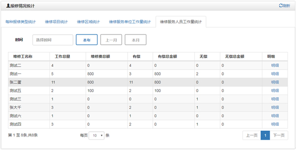 可以统计各个承修单位的工作量、各个维修服务人员的工作量,报修的收费情况等,便于了解维修情况,对各维修服务单位进行考核。