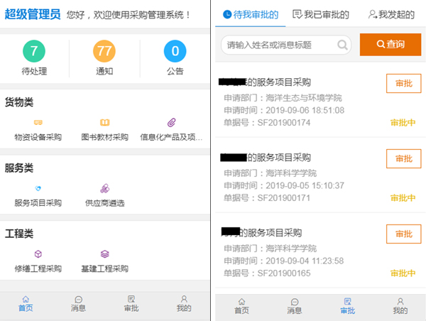 移动端:可通过微信公众号、移动门户在手机上进行各类操作,包括对需本人审批的业务进行审批、查询本人申请的业务的审批情况、申购单查询、消息通知、拍照上传等操作。