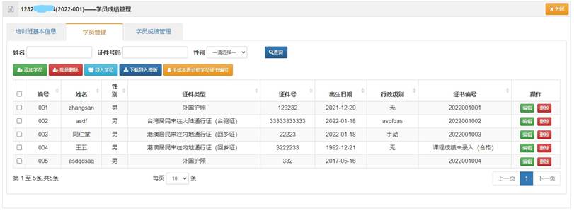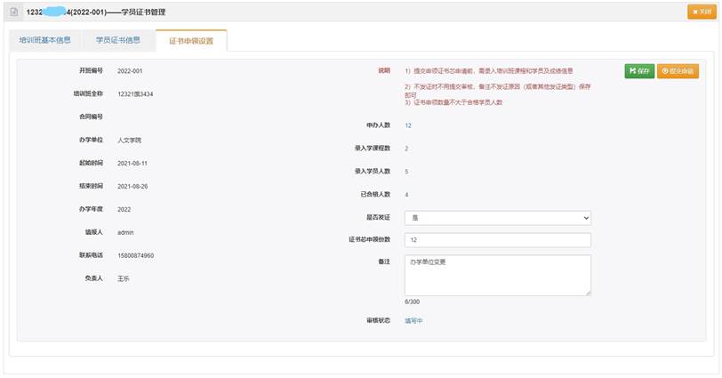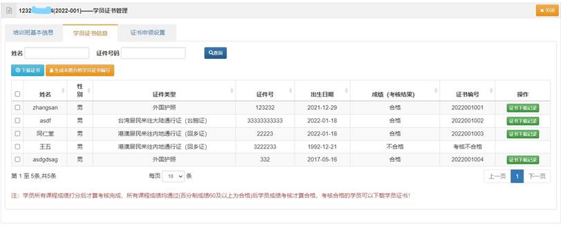 证书管理模块包含“培训班学员证书管理”和“班级证书申领审核”、“证书模板管理”等子模块,主要提供班级成绩考核合格学员的证书编号生成和批量导出学员证书,以及证书申领申请(经管理员审核通过后)用于学员结业后证书的发放。“模板管理”提供多种版式证书打印模板,按照学院及培训课程性质设置培训班默认打印使用证书模板。