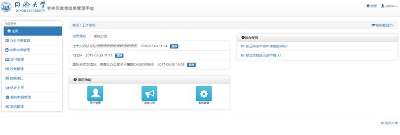 我司为同济大学开发的非学历教育信息管理平台,包括“非学历教育信息网”、“办班申请管理”、“学员成绩管理”、“证书管理”、“课程管理”、“师资管理”、“合同管理”、“数据接口”、“统计上报”等。
