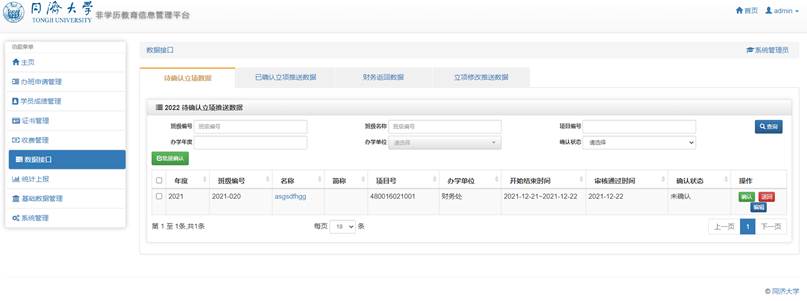 数据接口模块主要功能对接学校财务系统,推送非学历财务立项数据并获取财务立项结果,获取非学历收入和支出相关财务凭证数据,根据返回财务数据统计办班收入和支出。该模块包括“待确认立项数据”、“已确认立项推送数据”、“财务返回数据”和“立项修改推送数据”四个子模块。