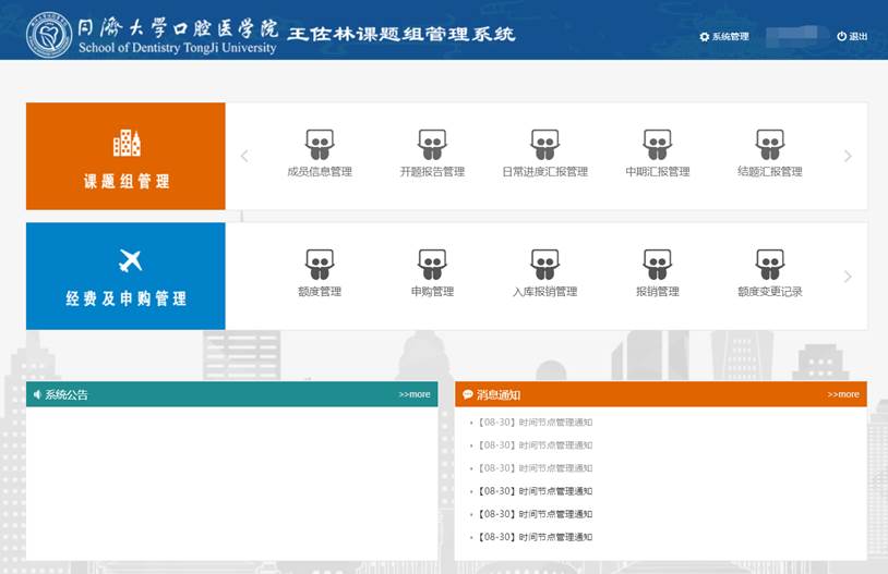 我司为同济大学口腔医学院开发的课题组管理系统,包括“成员信息管理”、“开题报告管理”、“汇报管理”、“考勤管理”、“额度管理”、“申购管理”、“报销管理”、“供应商管理”、“系统管理”等模块。