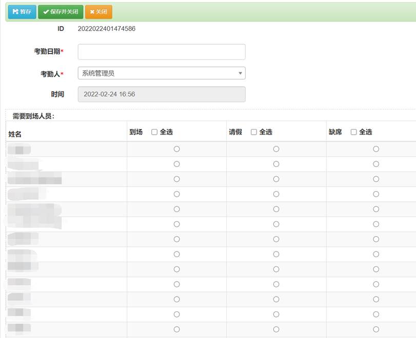 组会考勤人员对考勤进行管理,考勤人员选择组会,系统列出该组会需要到场人员,考勤人员对到场人员和汇报人员进行勾选。