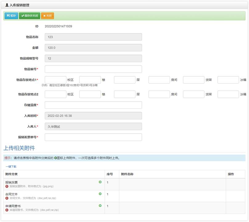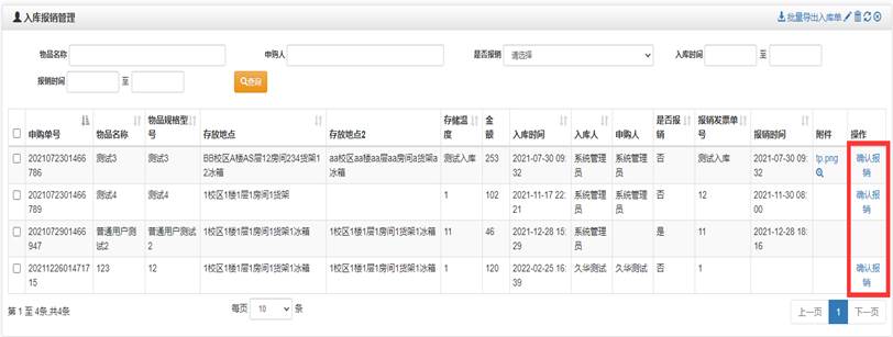 入库后需要进行报销管理,内容包括发票号、金额、对应的入库信息等,可上传发票,由专人进行审核确认,完成对发票信息的电子化管理。