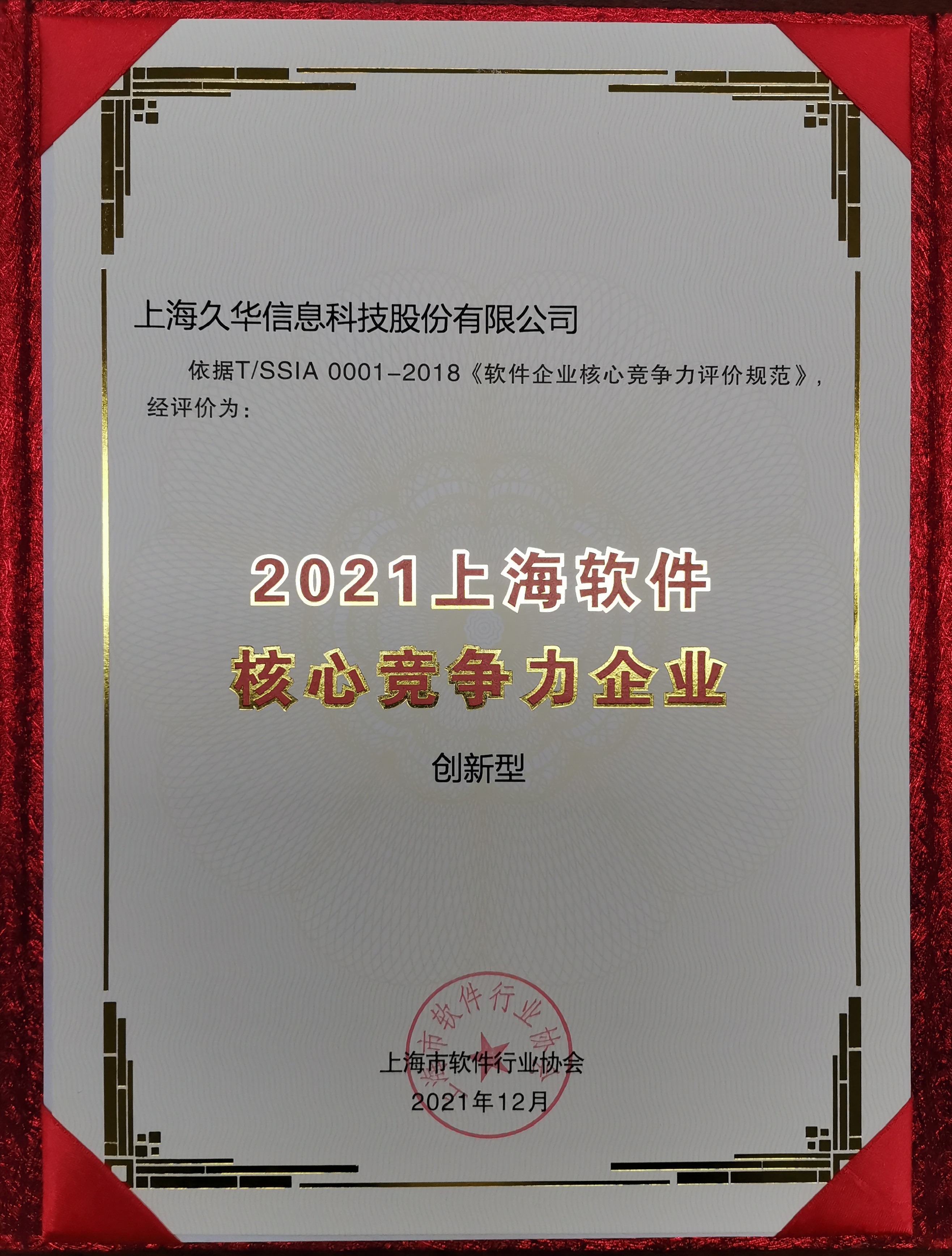 上海久华获得“2021年上海市软件核心竞争力企业(创新型)”荣誉证书